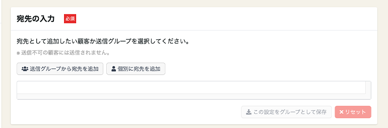 誰に配信するかを設定します。ここで、ステップ②で作成した送信グループを選択すると、一括で送信先を選択することができます。また、個別メールアドレスの追加も可能です。