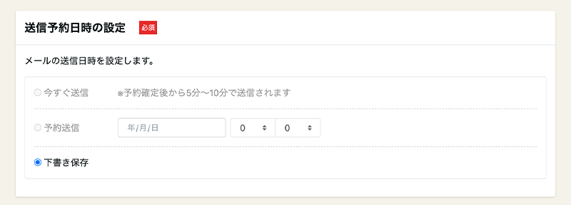 設定種類は「今すぐ配信」「日時を指定して予約配信」「下書き保存(まだ配信しない)」から選ぶことができます。