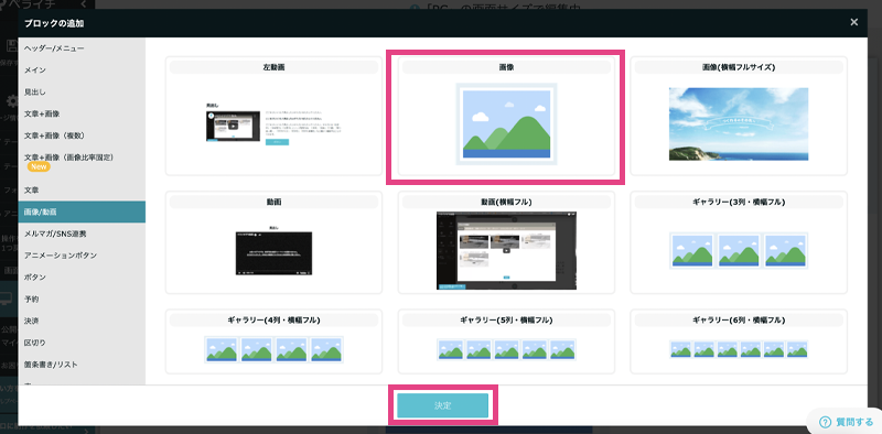 設置したいホームページの編集画面の「ブロック追加」から好きな画像/動画ブロックを選びます。