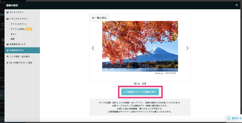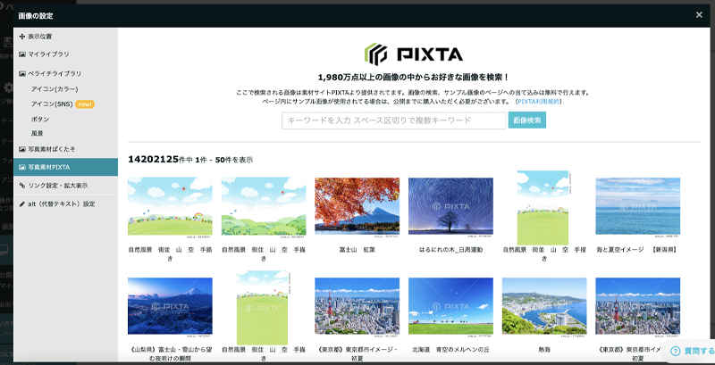 「写真素材PIXTA」から好きな画像を検索して選択しましょう。選択すると仮画像が編集画面に反映されますので、そのまま利用する際には、公開時に購入しましょう。