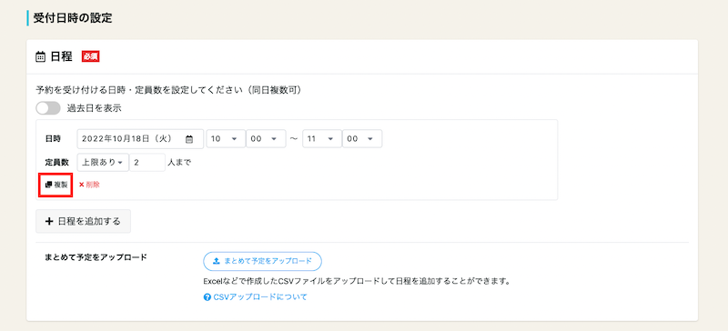 今までは同じ日・定員の条件で違う時間を追加したい場合は、1からすべての情報を設定する必要がありました。