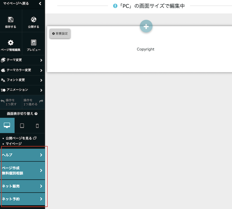 ページ編集画面の左メニュー下部を、シンプルな文言に修正・個別相談予約などのリンクを追加しました。