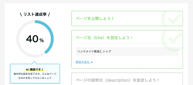また、「かんたんSEO対策」機能がついており、何をどう設定すればSEOを強化できるのか?どこまで設定できているのか?がすぐにわかるようになっています。