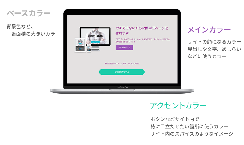 ベースとなるカラーを1色だけ選び、アクセントとなるカラー1~2色にするとサイト全体にまとまりが出ます。