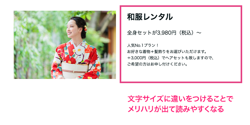 1番見てほしいところを強調することもできますし、デザイン全体にメリハリとリズムを生み出すことができます。