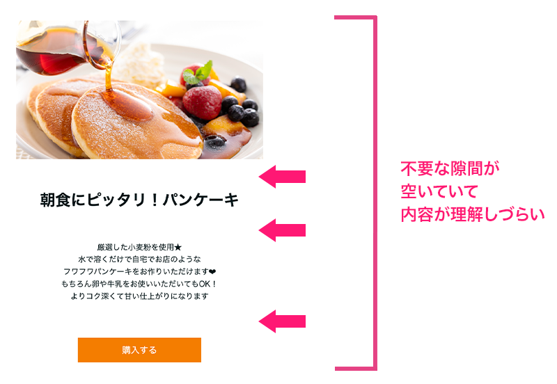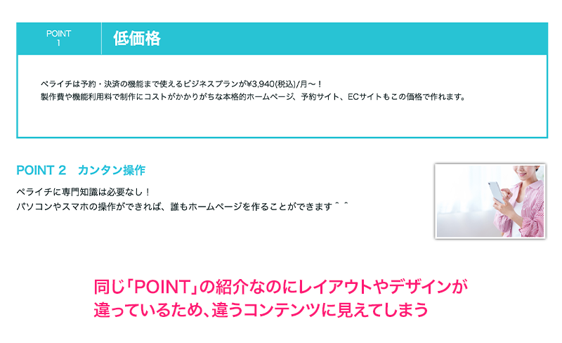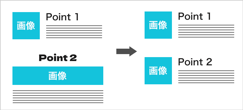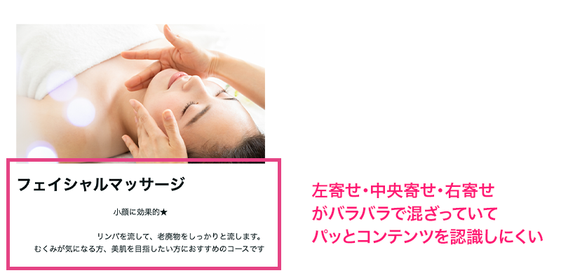レイアウトが1箇所だけズレている、左揃えの文章と中央揃えの文章が混ざっているなど、小さいレイアウト崩れをなくしましょう。