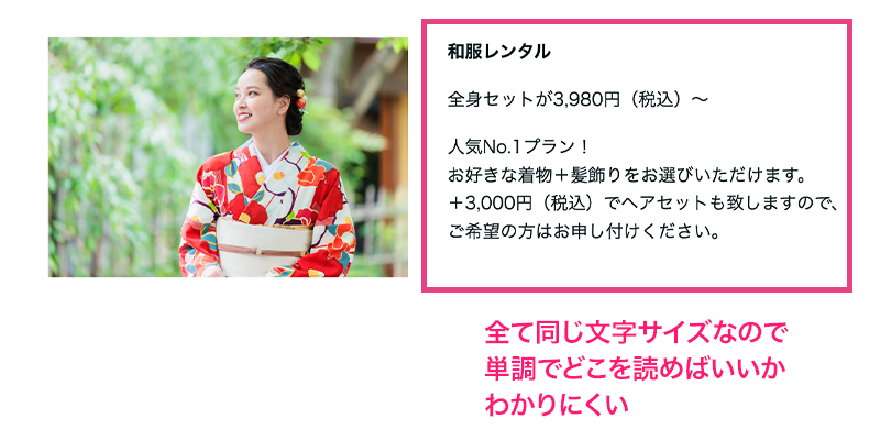 例えば、見出しと本文のある要素であれば、見出しは「28pt」、本文は「18pt」と大きく差をつけてOK!