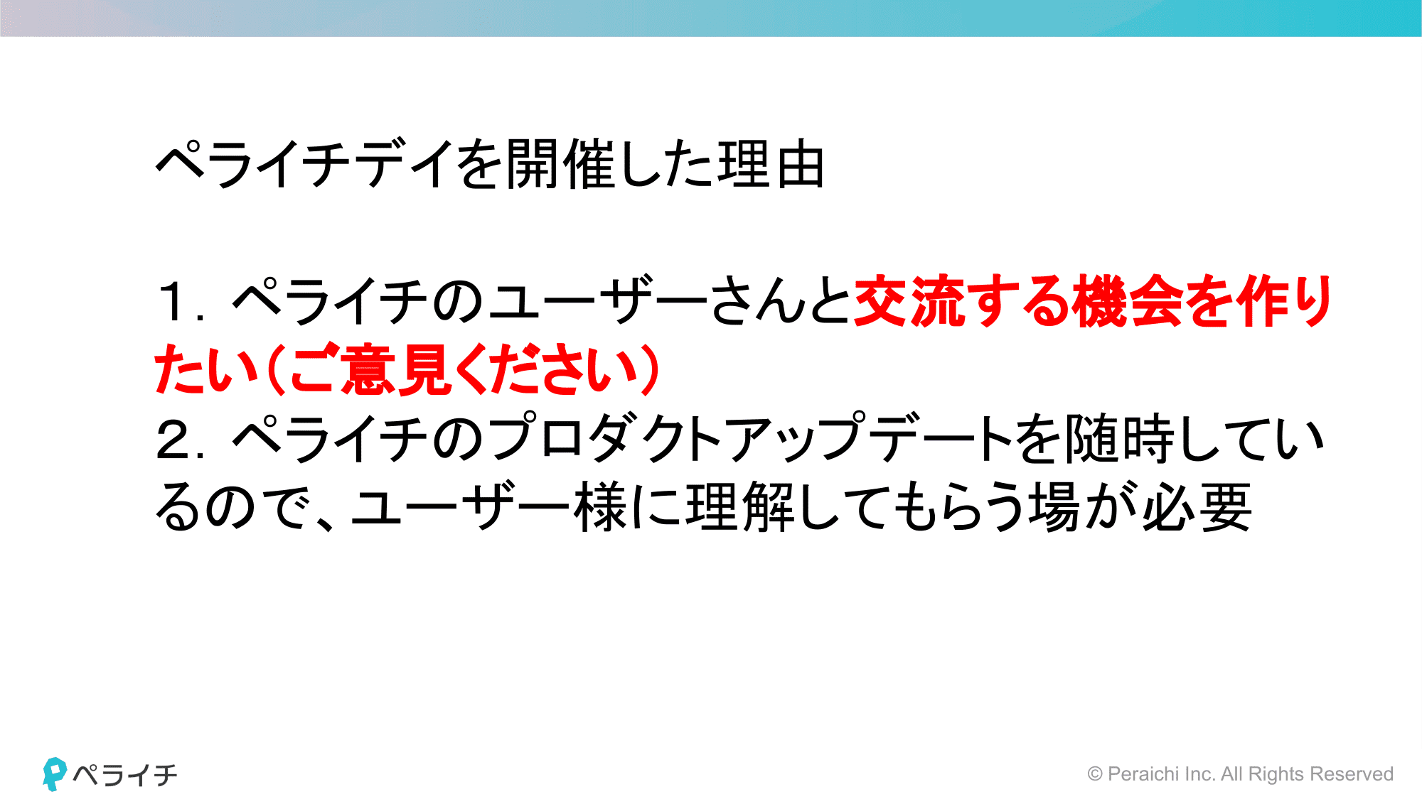最後に、執行役員 CMOから「ユーザーの皆様の役に立てるサービスとして引き続き精進していきます」との締めの挨拶でPeraichi Dayは終了です!