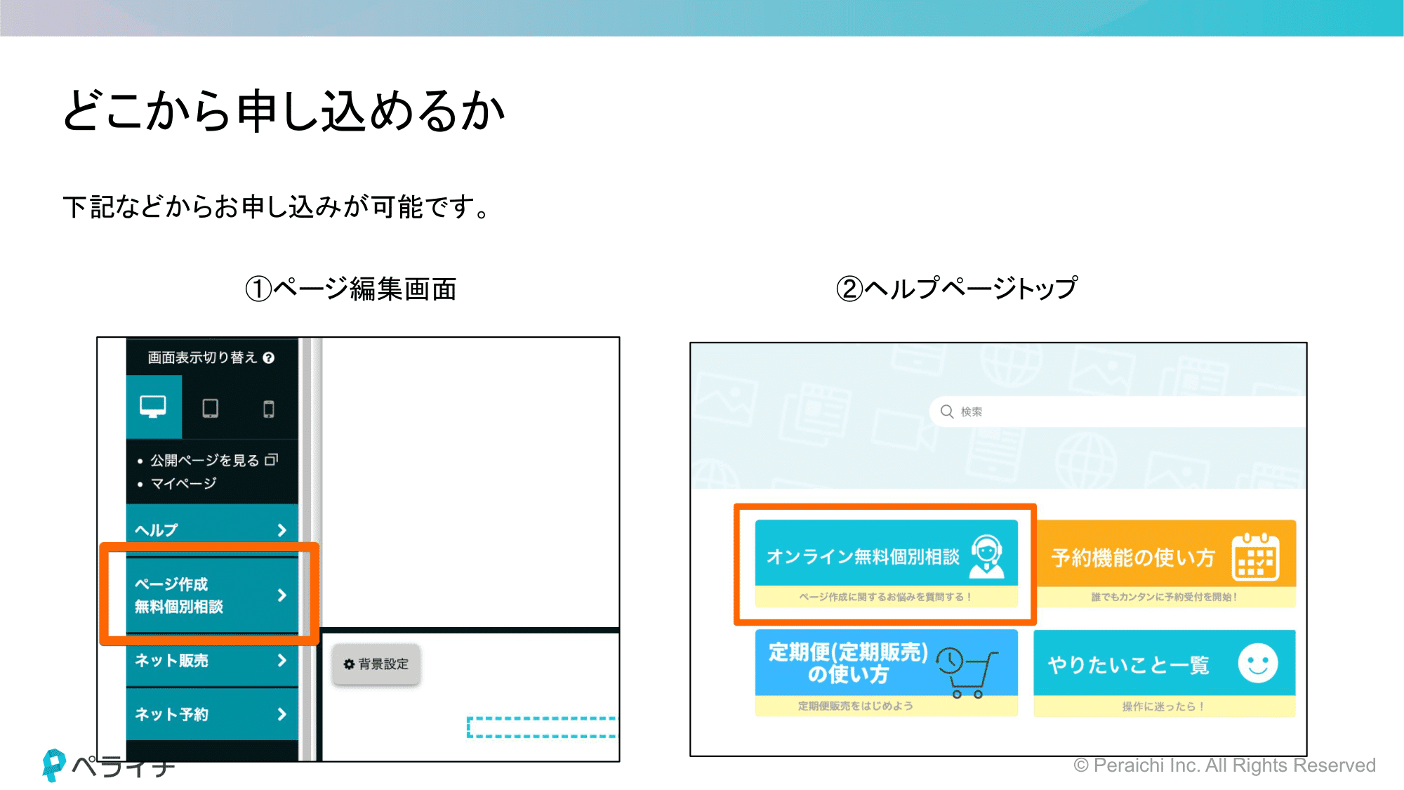 お申し込みは編集画面、またはヘルプページトップから行うことが可能です。