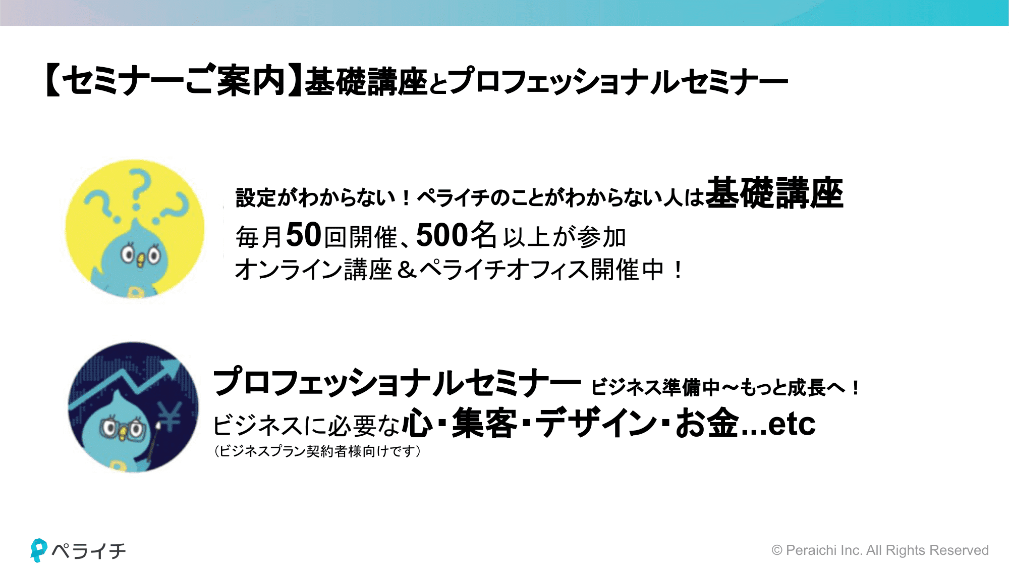 ペライチではページ作成などの基本的なものから集客などのビジネスに関するものまで幅広いオリジナルセミナーを開催しています。