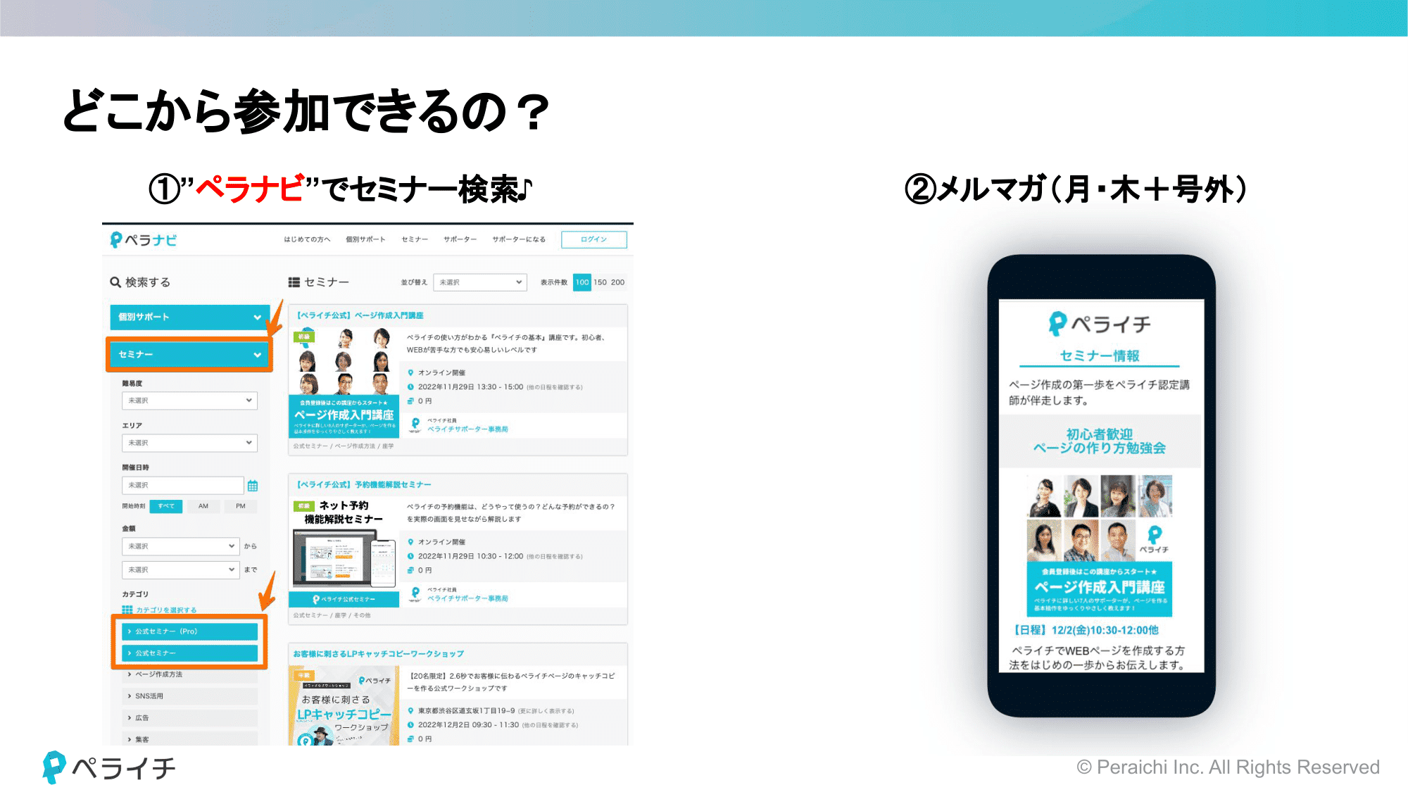 セミナー公式サイト「ペラナビ」またはメルマガからお申し込みできます。