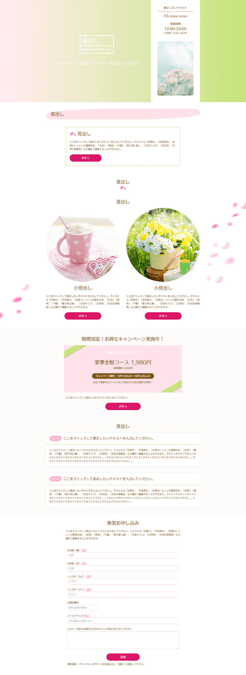 春テーマでは、春の暖かさや爽やかさを表現したいページや季節キャンペーンのページを作成できます。