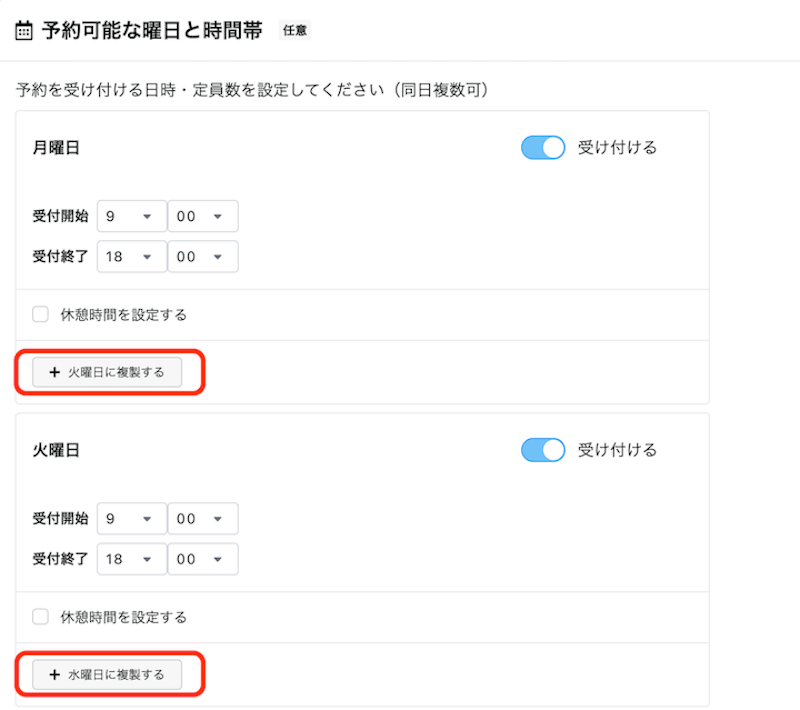 予約枠の曜日ごとの設定を別の曜日に複製できるようになりました。