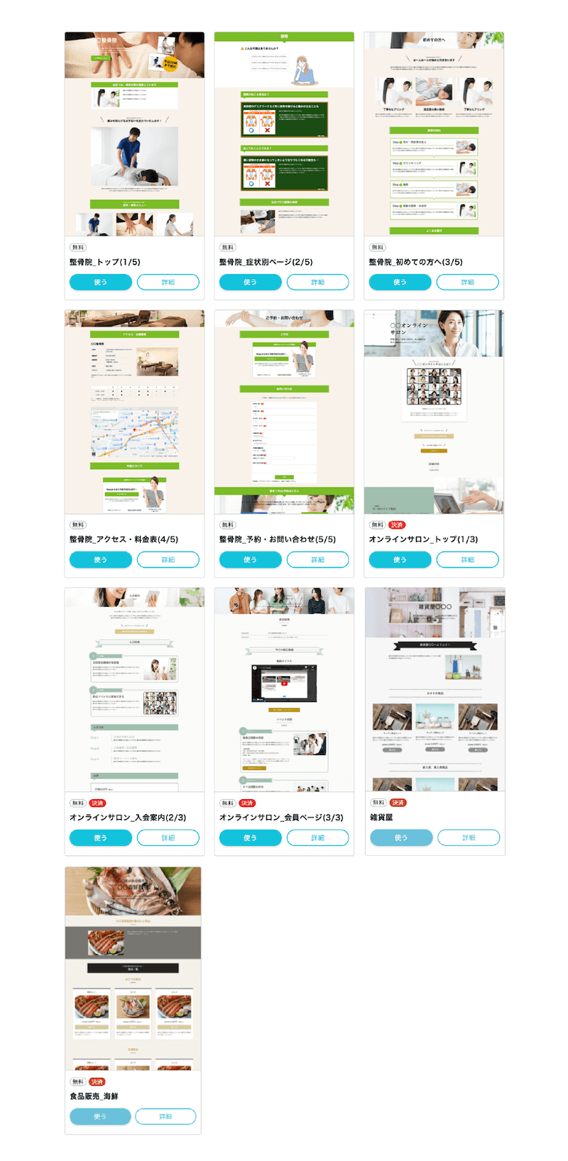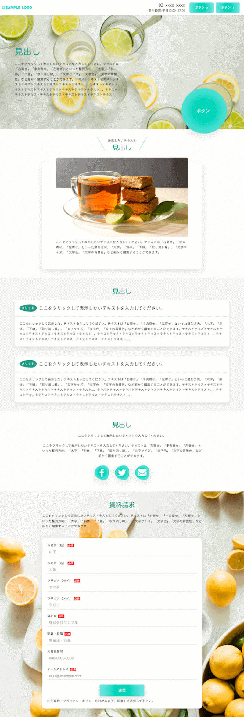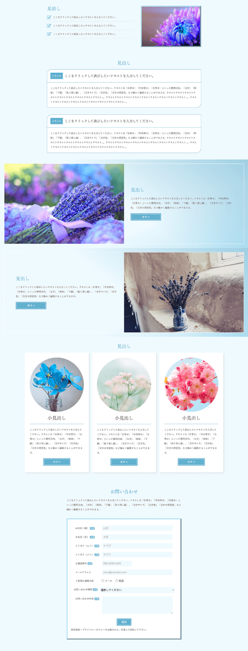 さわやかのテーマでは、化粧品やジュースバーなど新鮮な雰囲気のページを作成できます!
