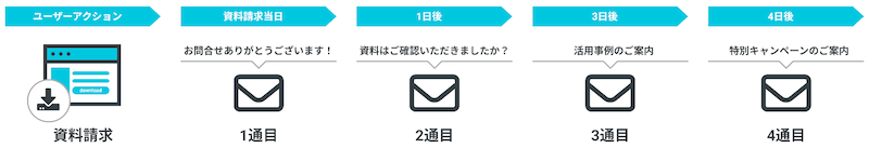 例えば、フォームで資料請求があったユーザーに対して、1日後、3日後、4日後に、自動で送信されるメールを組むことが可能です。
