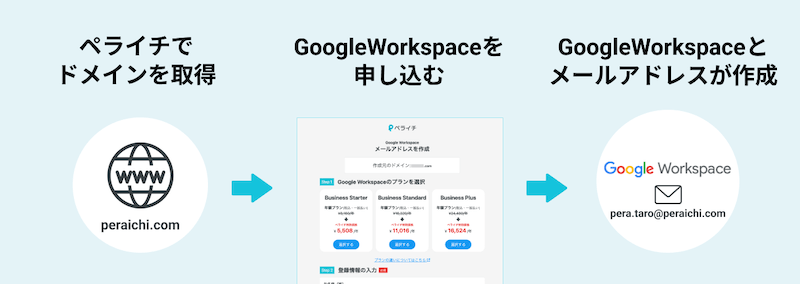 ペライチで取得した独自ドメインで、Google Workspaceのアカウントとメールアドレスの作成ができます。
