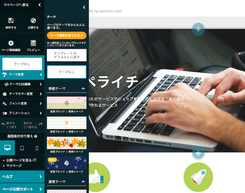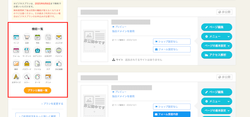 ペライチのマイページから、今のプランで利用できる機能がアイコンでわかるようになりました♪
