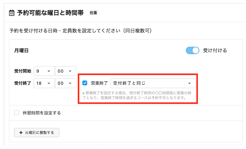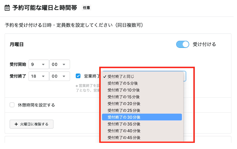 営業終了時間は、受付終了時間と同じ、もしくは受付終了後の経過時間で設定ができます。