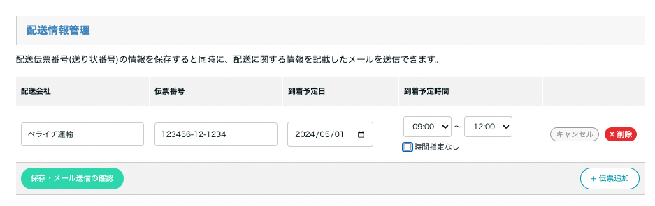物販など商品購入をした購入者へ、配送した際の配送伝票番号(送り状伝票番号)や、到着日時が登録できるようになりました。