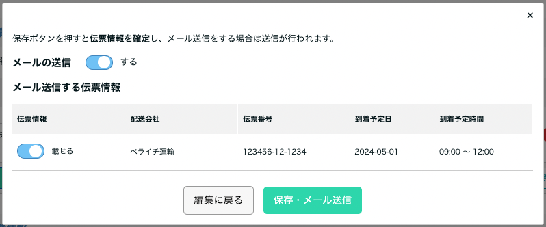 ▼配送情報管理 メール送信・保存画面