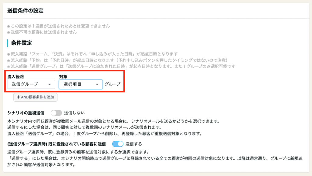 事前に送信グループを作成し送信条件に設定することで、すでに送信グループ内に存在する顧客、以降追加された顧客を送信対象にすることができます。