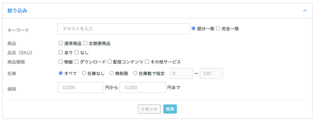 商品種別や、品目の有無、在庫や価格などで絞り込みができるようになりました。