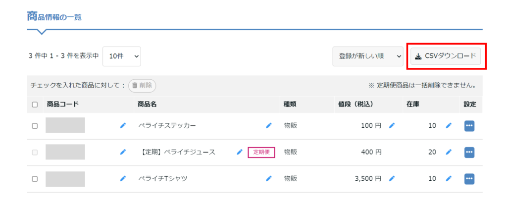商品管理画面から、商品情報の一覧をCSVファイル形式でダウンロードすることができるようになりました。