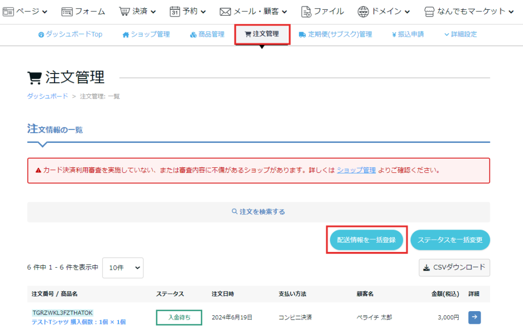 上部メニューで「決済管理」>「注文管理」を選択し、「配送情報を一括登録」から登録作業を行います。
