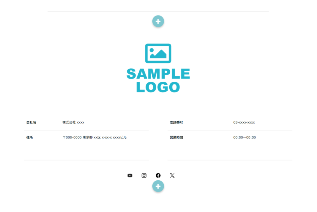画像とともに会社情報を入力。各種SNSも追加ができるブロックです。