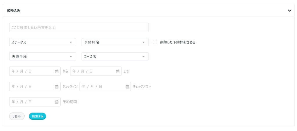 エンドユーザーの予約の確認をする際にも、フリーキーワードで検索ができるほか、ステータス・予約枠名・決済手段・コース名・期間で絞り込むことができます。