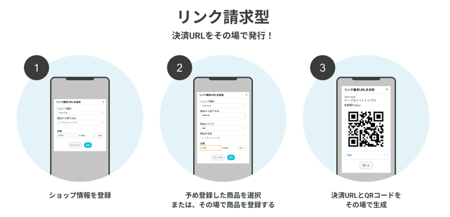 エンドユーザーが商品・サービスを購入するシーンやパターンに合わせてその場で商品を設定し、決済リンク(URL・QRコード)を発行できるようになりました。この機能により即時請求・直接決済いただけます。
