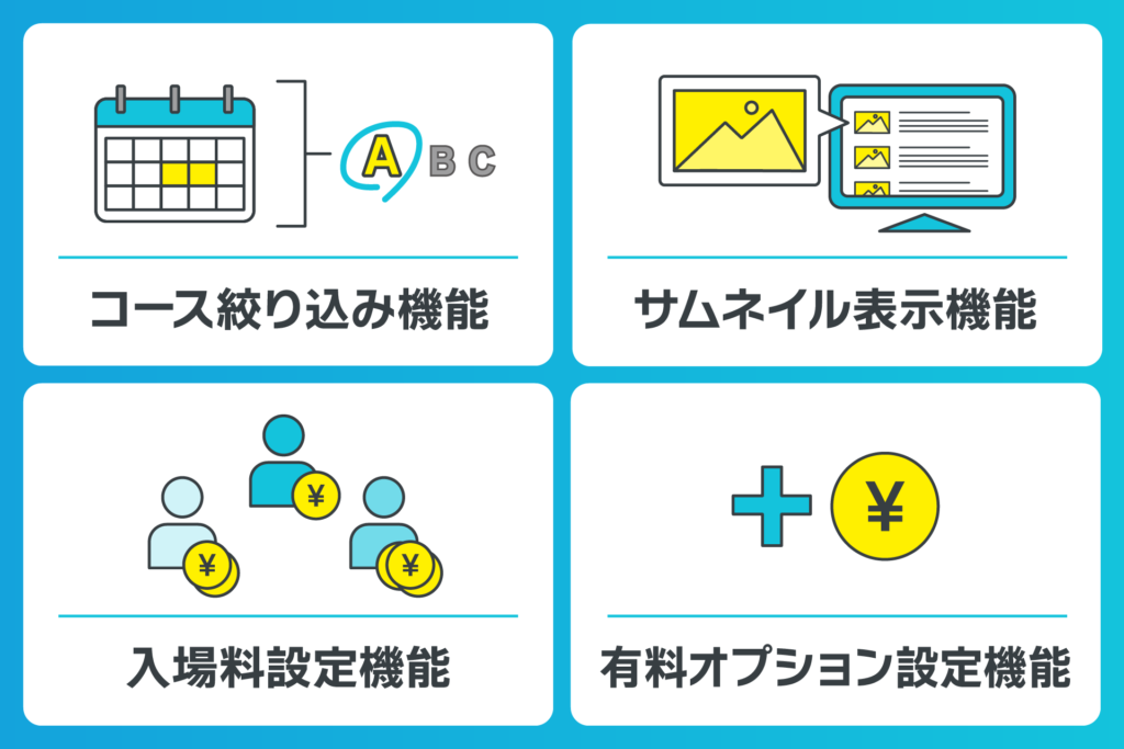 コースに追加でオプションサービスを設定できる機能が実装されました。これにより、エンドユーザーは必要に応じて、レンタル品や特別なサービスを予約時に選択し、よりパーソナライズされた体験が可能になります。また、管理者側もオプションサービスの申し込み状況を事前に確認でき、かつ集金もすべてオンラインで完結できるようになり、運営しやすくなります。
