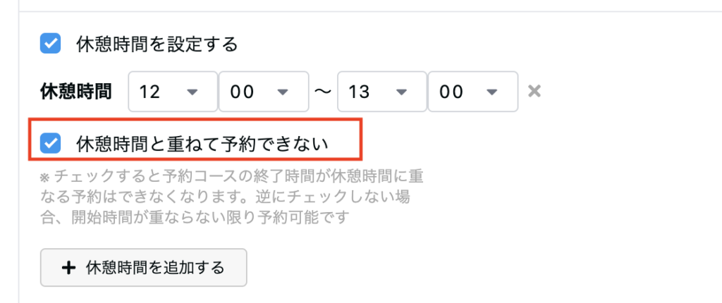 「休憩時間と重ねて予約できない」にチェックを入れると終了時間が休憩時間と重なる予約を受付不可にでき、チェック無しの場合は、開始時間が休憩時間と重なっていなければ予約可能となりました。