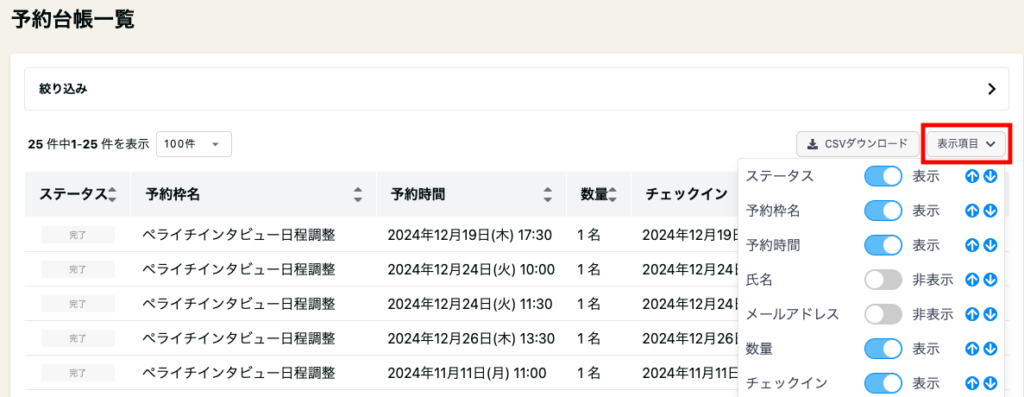 また、表示項目を整理した設定を保存し、その設定のままCSVダウンロードも可能です。