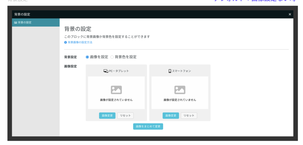 「PC・タブレット」「スマートフォン」それぞれお好みの画像に変更もでき、同じ画像にまとめて変更も可能です。