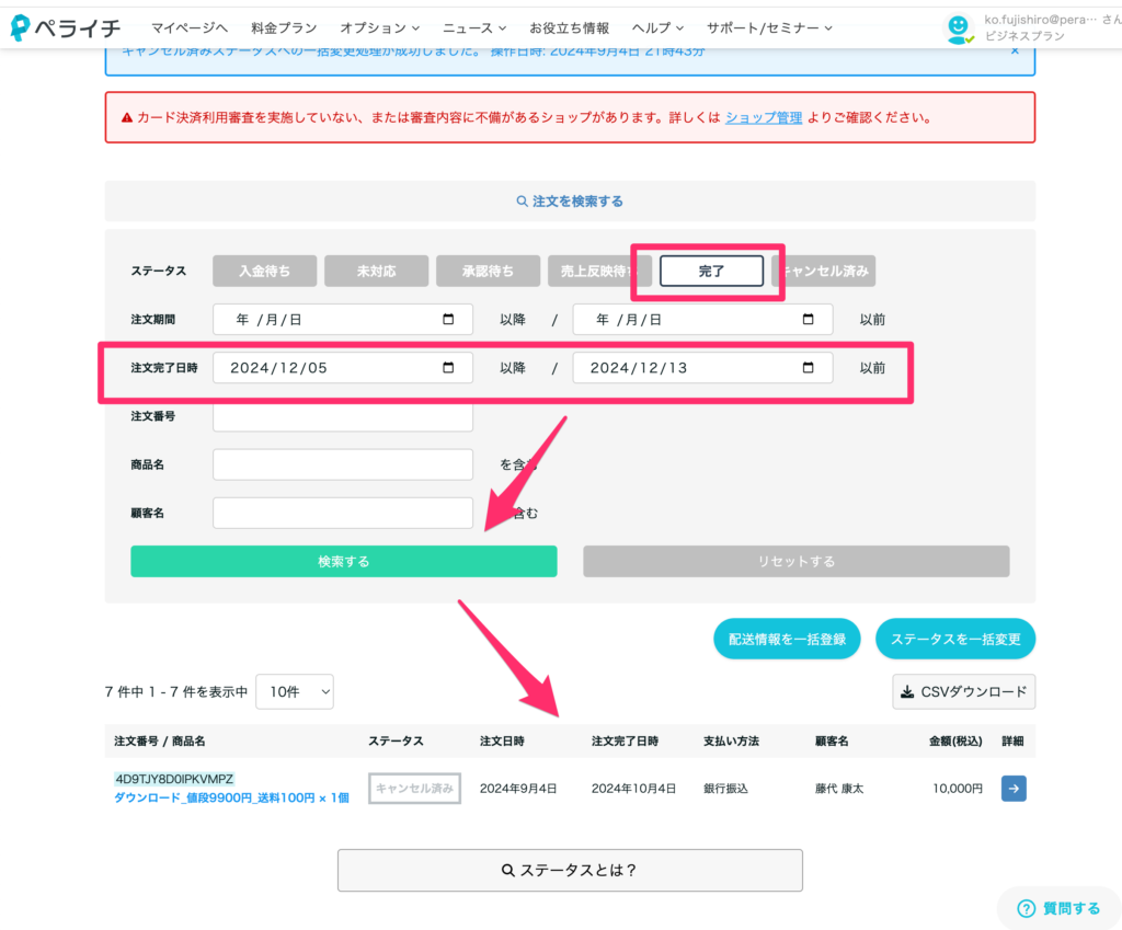 さらに、注文一覧画面で「注文の完了日」が含まれた状態でCSVダウンロードも可能です。