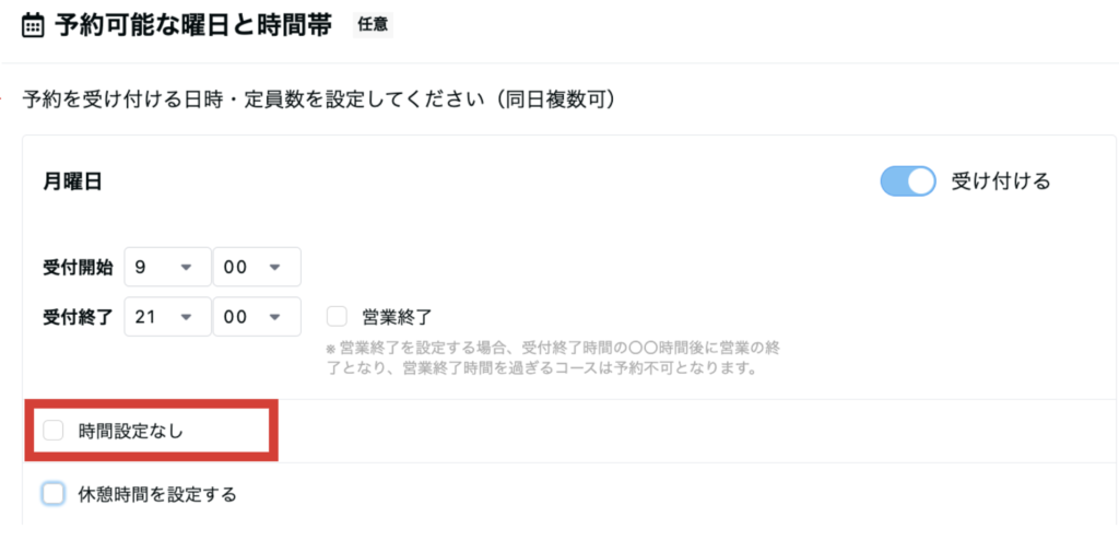新たに予約枠を作成する際に、時間指定なしでの予約受付が可能となりました。