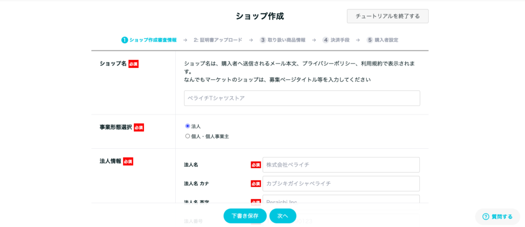 チュートリアルに沿ってご自身の情報を入力していくだけで簡単にショップの作成が可能です。
