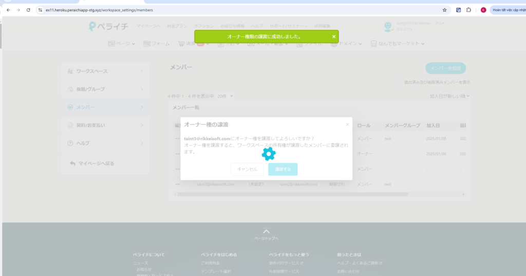 ③「譲渡する」ボタンをクリックしたら、「オーナー権限の譲渡に成功しました。」とのメッセージが表示され、メンバーにオーナー権限を譲渡完了です。