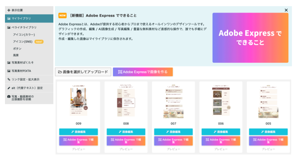 • 既存画像編集:Adobe Expressを使用したマイライブラリにある画像の編集・加工