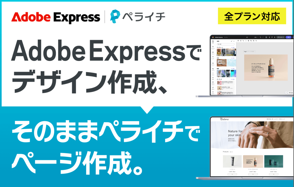 このたび「ペライチ」に Adobe社が提供するデザインツール「Adobe Express」が連携いたしました。