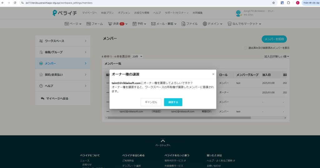 ②「オーナー権の譲渡」ボタンをクリックしたら、確認モーダルが表示されます。