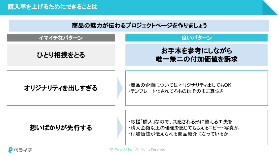 上記をふまえてプロジェクトページを作成することで、購入率UPにつながります。