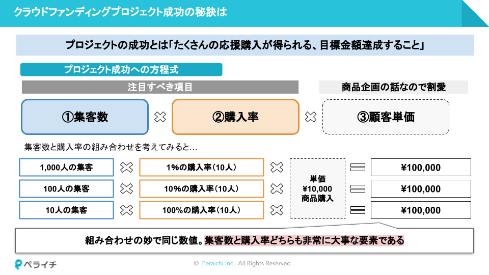 そんなクラウドファンディングの成功をするうえで欠かせないのが集客数と購入率です。