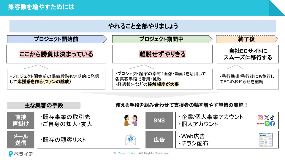 なぜこのプロジェクトを始めるのか、どのような思いで何を実現したいのか。プロジェクト開始前の準備段階から定期的に情報を発信し、応援感を作る(ファンの醸成)ことから始めましょう!