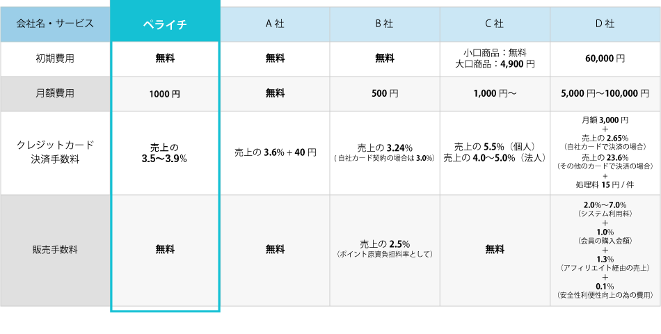 「ペライチ決済」のクレジットカード手数料は、業界最低水準の決済販売手数料売上の3.5%(VISA、Master)、もしくは3.9%(AMERICAN EXPRESS、JCB)。