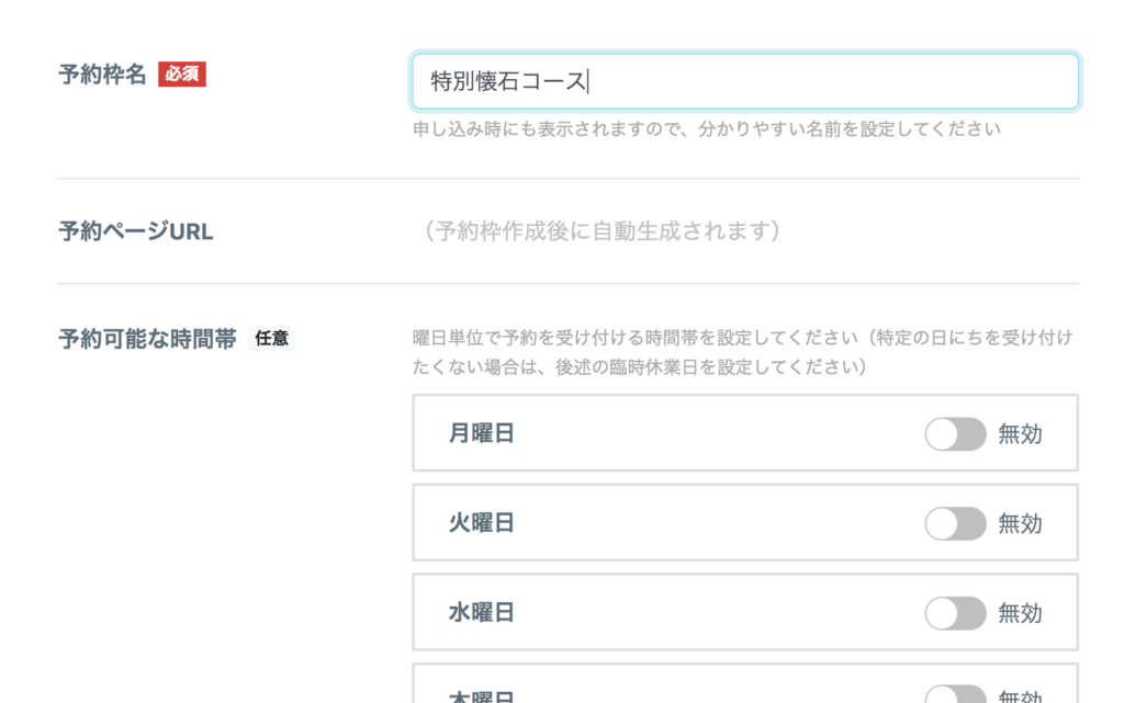 予約する店舗名や、担当者名、予約するコース名等、予約者にわかりやすい名称をつけてください。