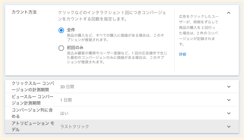 「目標とアクションの最適化」と「コンバージョン名」は任意のものを選択・入力。主に管理するときに使うものなので、分類や管理のしやすいものでOK。