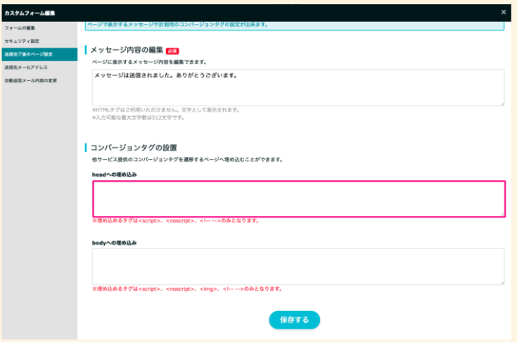 ペライチページ編集画面→フォームブロック「編集」→カスタムフォーム編集「送信完了後のページ設定」内のコンバージョンタグの設置「headへの埋め込み」に