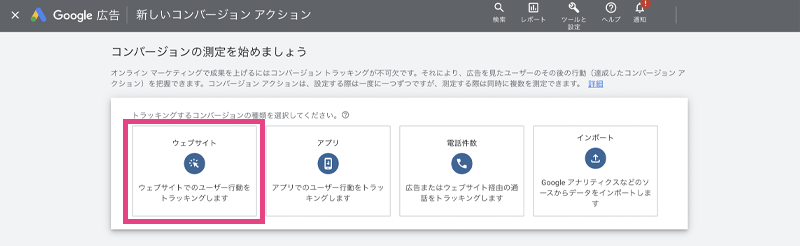 トラッキングするコンバージョンの種類から「ウェブサイト」を選択する